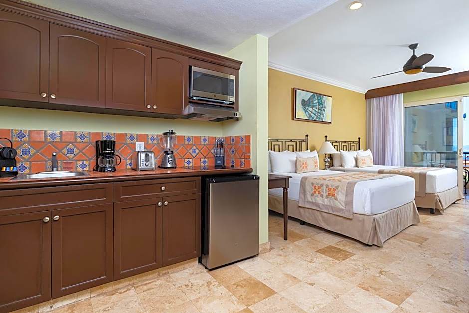 Junior Suite Ocean View, up to 2 adults and 2 kids or 3 adults. Rooms include a king-size bed or two queens, adjoining bathroom, a kitchenette with coffee maker, electric stove top, microwave, mini-bar and a toaster, balcony, includes specials amenities.